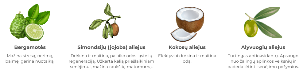 Pagamintas iš natūralių ingredientų, kurie rūpinasi oda.