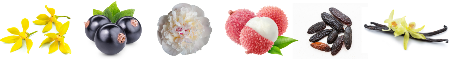 ylang-ylang • juodieji serbentai • bijūnai • ličiai • tonka pupelės • vanilė